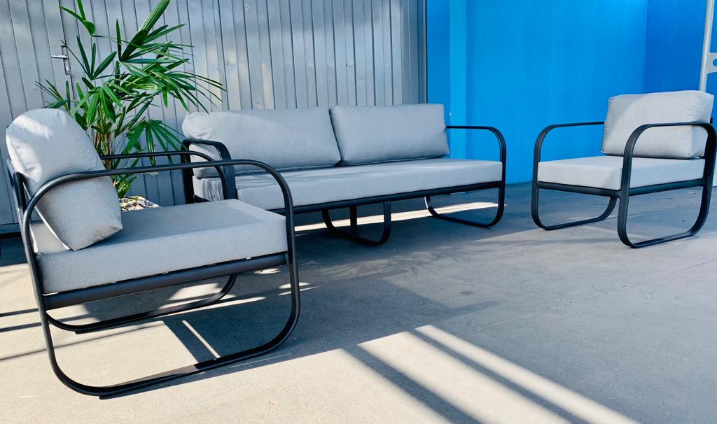 Linha composta com poltrona, sofá e mesa de centro. Possui um design super moderno com sua estrutura em alumínio com pés arredondados que da a sensação de movimento.