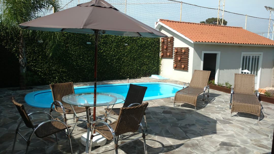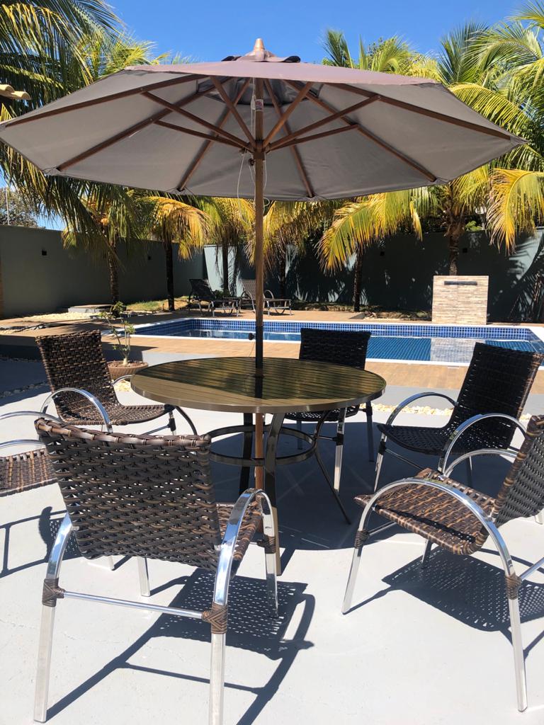 Incluso: 6 cadeiras, 1 mesa europa 100% aluminio circ 120, 1 ombrelone madeira tecido bagum , 1 base em plástico