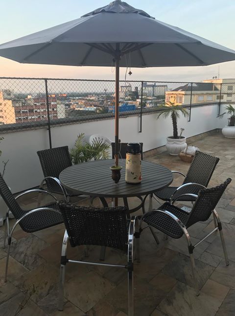 Incluso: 4 cadeiras, 1 mesa europa 100% aluminio circ 100, 1 ombrelone madeira tecido bagum , 1 base em plástico 2 espreg. tropical 1 mesinha