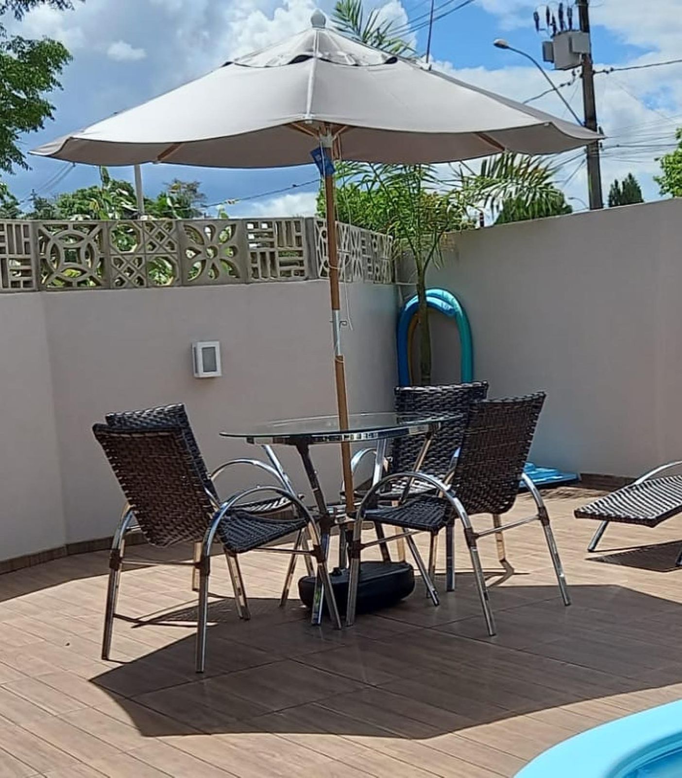 Incluso: 4 cadeiras atlanta + 1 mesa stª mônica circ 80 cm + 1 vidro 100 mt + 1 ombrelone madeira 240 + 1 base em plastico + 2 espreg. atlanta