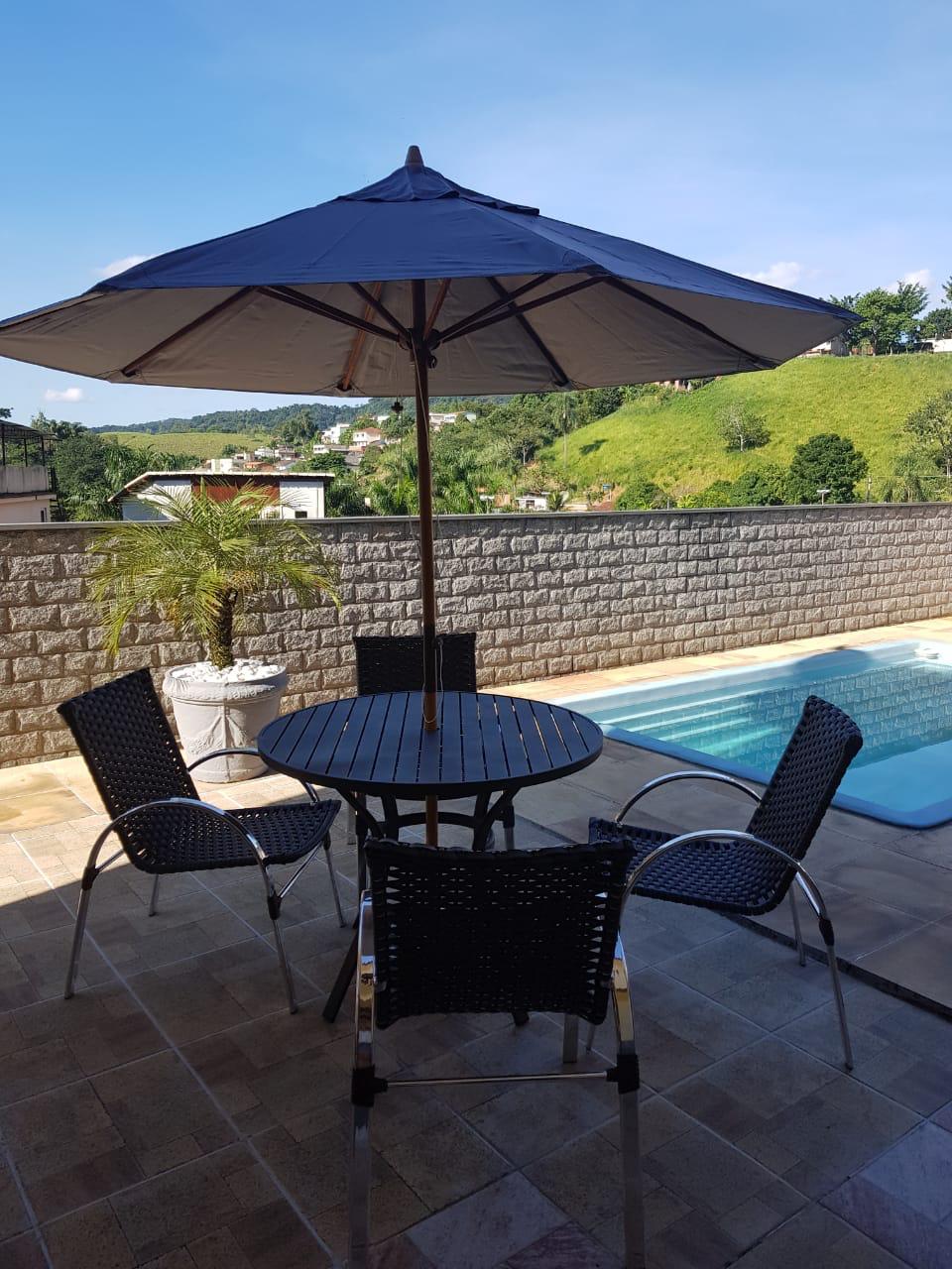 Incluso: 4 cadeiras atlanta + 1 mesa stª mônica circ 80 cm + 1 vidro 100 mt + 1 ombrelone madeira 240 + 1 base em plastico